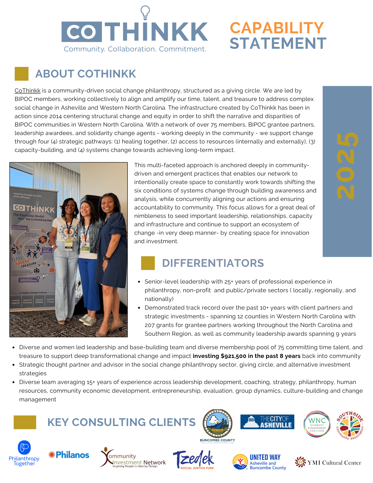 CoThinkk is a community-driven social change philanthropy that centers structural equity, deepens leadership capacity, and creates long-term impact across Western North Carolina and beyond. With over 75 BIPOC members and nearly a decade of experience, we’ve invested over a million dollars back into communities through strategic partnerships, training, and systems-change initiatives.
